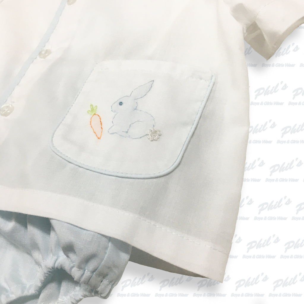 Soft, classic, and made for spring celebrations, our Blue Bunny Button-Up Set is a charming choice for Easter, church, and special occasions. Featuring a crisp white button-up top with delicate blue trim and a precious bunny detail, paired with coordinating bloomers, this baby boy outfit blends comfort with timeless Southern style.